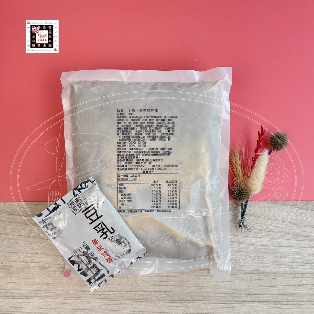 內容物:水、帶骨羊肉、米酒、醬油、辣豆瓣醬〔黃豆、辣椒、水、鹽、砂糖、麻油、粘稠劑(乙醯化己二酸二澱粉、玉米糖膠)、調味劑(L-麩酸鈉、琥珀酸二鈉)、甜味劑(醋磺內酯鉀)、防腐劑(己二烯酸鉀)、品質改良劑(偏磷酸鈉)、著色劑(食用色素四十號)〕、薑、冰糖、調味劑(L-麩酸鈉、胺基乙酸、L-天門冬酸鈉、5'-次黃嘌呤核甘磷酸二鈉、5'-鳥嘌呤核甘磷酸二鈉、DL-胺基丙酸、琥珀酸二鈉)、油蔥酥、胡麻油、鹽